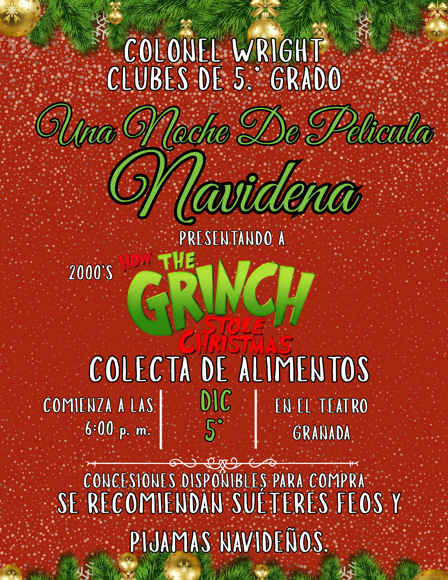 In partnership with our generous donors this month, the 5th grade food drive club is hosting a free movie night at The Granada on Friday, December 5th at 6pm! They will be playing Dr. Seuss' The Grinch!
