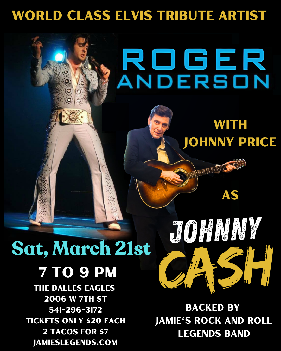 Elvis and Johnny Cash Tribute. March 21, 2026 7 pm to 9 pm with taco bar dinner before show. Tickets are $20 each. Contact The Dalles Eagles for more info 541-296-3172